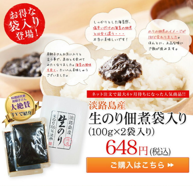 ◆大人気商品がお得な袋入りで新登場◆淡路島生のり佃煮 100g×2袋入 【淡路島 鳴門千鳥本舗】岸朝子さん 著名人の最後の晩餐 女性セブン 爆報フライデー 生海苔